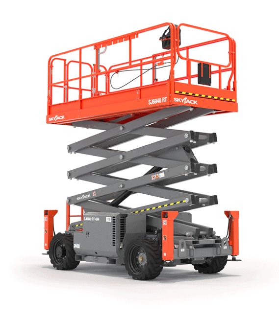 Skyjack's new SJ6940 RT offers unequaled rough terrain performance with 4 wheel drive and oscillating front steer axle. It's not only the highest working height, but also offers the longest working area in its class. These new scissors are an ideal solution for outdoor and indoor jobsites.
